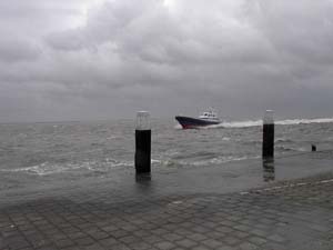 Schiermonnikoog 03-05-2003 Door de weersgesteldheid en de voorspellingen voor de rest van de dag moest de organisatie besluiten het programma om te zetten. Verwacht werd dat velen niet zouden besluiten naar de Veerdam te gaan. Daarom werd besloten om een pendel in te zetten tussen het Vissershuis en de Veerdam voor diegenen die met de Koning Willem I wilden meevaren. Een koppig zeetje en harde wind zorgde ervoor dat de meevarenden goed kennis konden nemen met de vaarmogelijkheden van deze snelle reddingboot. Twee MAN-dieselmotoren van elk 1000 pk drijven twee Hamilton-waterjets aan, die de boot een maximum snelheid van circa 32 knopen (=ca. 60 km/uur) kunnen geven. De Koning Willem I heeft een lengte over alles van 18.80 meter en kan 120 geredden aan boord nemen. Voor velen was het meevaren een gebeurtenis waarover men nog lang zal kunnen nagenieten. Bij het Vissershuis stonden voertuigen van de Brandweer,
